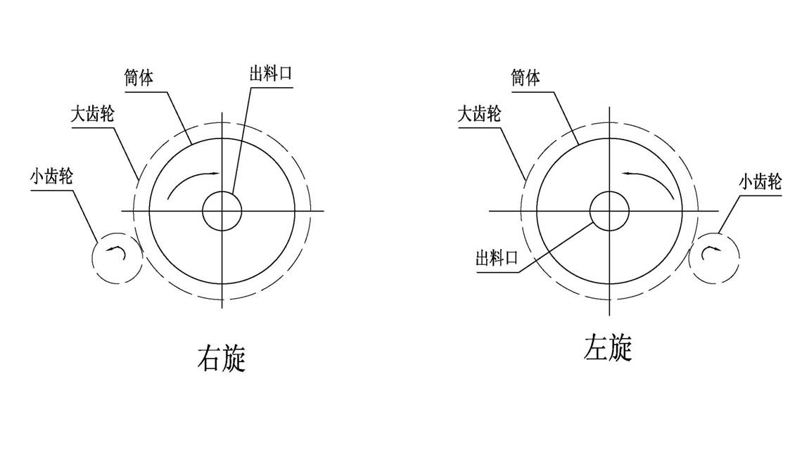 有許多客戶經(jīng)常會(huì)問(wèn),怎么才能正確的判斷球磨機(jī)運(yùn)轉(zhuǎn)時(shí)是左旋還是右旋,今天河南豫暉礦山機(jī)械有限公司技術(shù)人員以圖為為例為大家解這個(gè)因惑:要想判斷球磨機(jī)是左旋還是右旋,要從球磨機(jī)出料口(靠近大齒輪一端)向進(jìn)料口方向看,筒體逆時(shí)針旋轉(zhuǎn)為左旋,筒體順時(shí)針旋轉(zhuǎn)為右旋;在布置圖上,左旋布置時(shí),傳動(dòng)部分(過(guò)橋)在筒體右側(cè);右旋布置時(shí),傳動(dòng)部分(過(guò)橋)在筒體左側(cè)。如下圖所示: