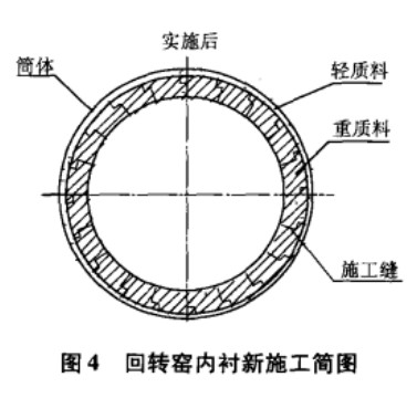 經(jīng)過與原料廠家、大修部門對該問題的共同探討,較確定將原有兩條澆注料之間的直縫施工修改為有錯臺的施工縫,阻擋在高溫條件下高溫炭粉由施工縫進入輕質(zhì)料層;剞D(zhuǎn)窯內(nèi)襯新施工簡圖見圖4。此項措施較明顯地改善了內(nèi)襯的使用狀況,次采用就使回轉(zhuǎn)窯內(nèi)襯的使用壽命提高到了440天以上。