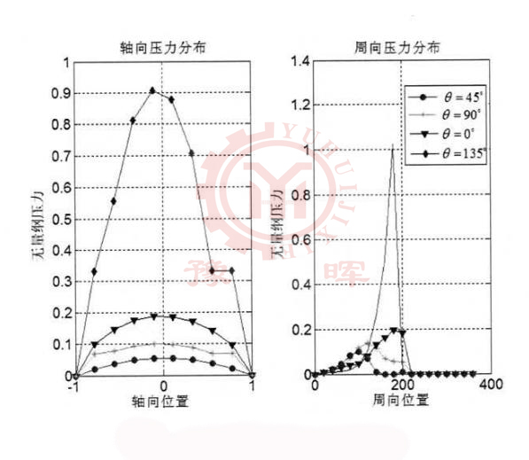 由不同旋轉(zhuǎn)角度下的球磨機橢圓軸處的油膜厚度分布情況我們可以知道,隨著橢圓的長軸圍繞主軸軸心做逆時針運轉(zhuǎn),此時的動靜壓軸處油膜厚度也會發(fā)生一定的變化,而較小油膜的厚度則是先增加后減小然后在增大的變化。同時我們還可以了解到球磨機油膜厚度會有兩個較低谷出現(xiàn),這些低谷則意味著動壓油楔的產(chǎn)生,同時此區(qū)域也是我們所稱的動壓力區(qū)。
